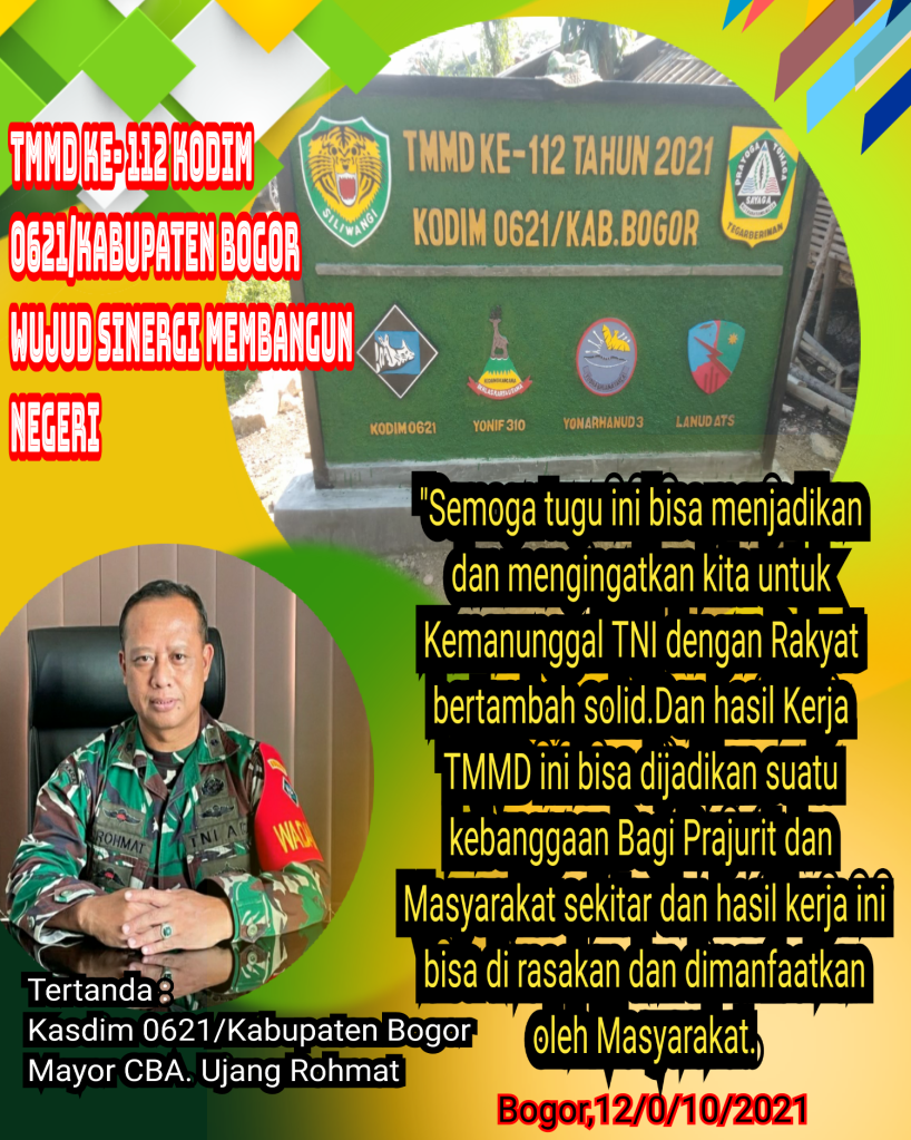 Kepala Staf Kodim ( Kasdim ) Mayor CBA.Ujang Rohmat sangat mengapresiasi telah berdirinya sebuah Prasasti TMMD ke – 112 Kodim 0621/Kabupaten Bogor tahun 2021.Sehingga melalui pesan pribadinya Hari Selasa 12 Oktober 2021 menyampaikan apresiasi tersebut.